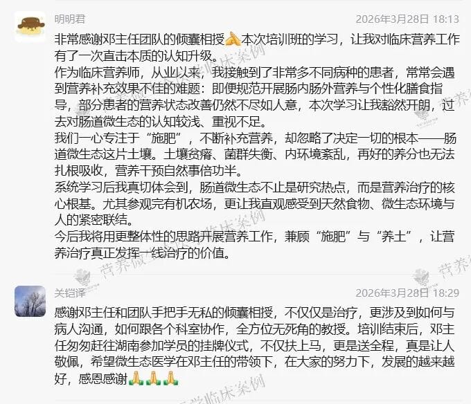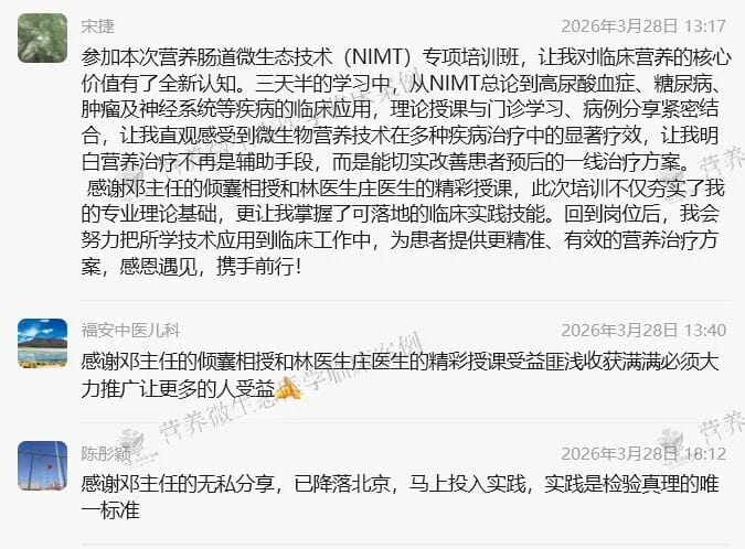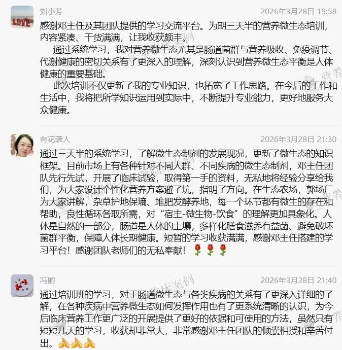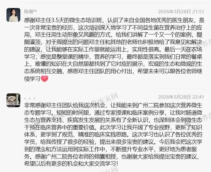 3天半的学习,学员们表示:为期三天半的营养微生态培训,内容紧凑、实用性很高,回去后工作里就能运用上;也是对临床营养工作一次直击本质的认知升级,人体是自然的一部分,肠道是人体的土壤,多样化膳食滋养有益菌、避免破坏菌群平衡,保障人体长期健康,让营养治疗真正发挥一线治疗的价值。